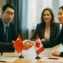 加拿大与中国商务人士在会议桌前握手,桌上摆放两国国旗,象征中加经贸合作。