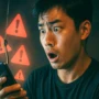 A man looks shocked at his smartphone screen showing red warning icons and a fishing hook, symbolizing a phishing scam risk