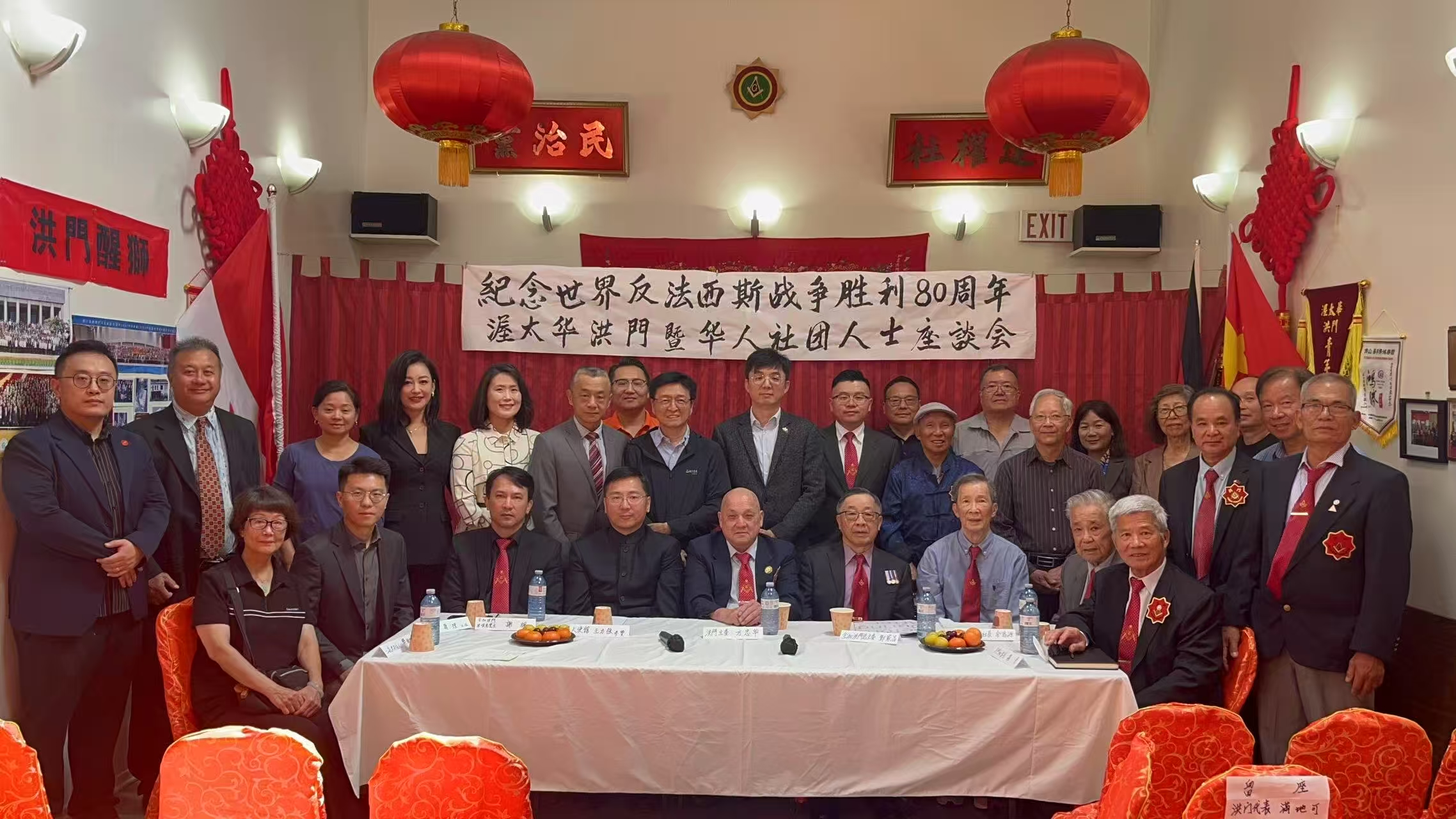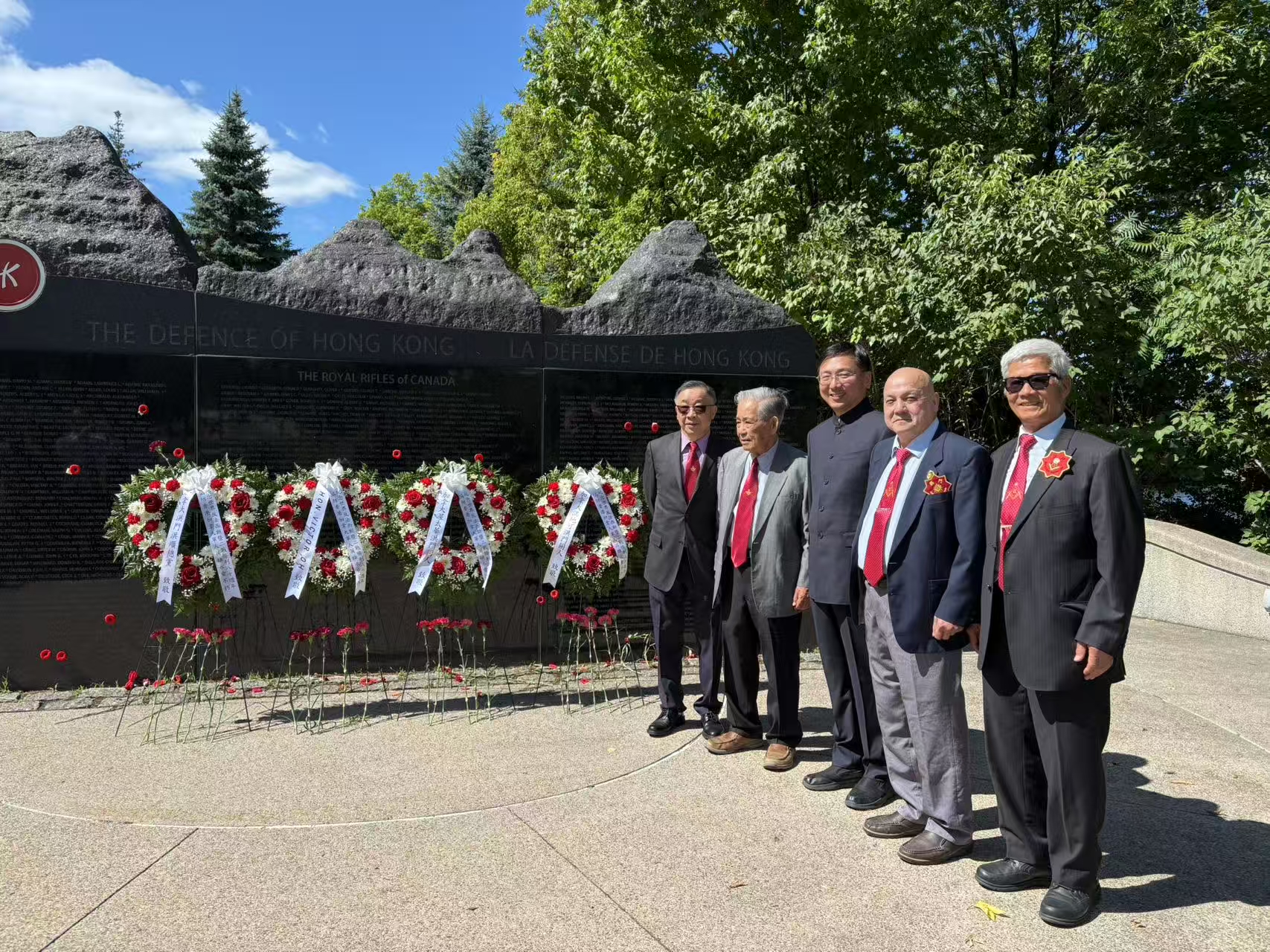 纪念世界反法西斯战争胜利80周年,渥太华洪门民治党举办华人社团人士座谈会後,各华人社团代表前往渥太华 115 Sussex Dr 的 Defence of Hong Kong Memorial Wall 敬献花圈与鲜花。洪门准备了康乃馨供嘉宾敬献,以表达对抗战先烈的崇高敬意。中国驻加拿大大使馆 王力强参赞 和 蒋理领事 出席活动。现场庄严肃穆,气氛感人。